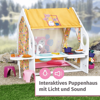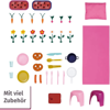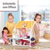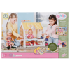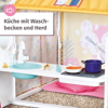 Baby House with Kitchen: The interactive dollhouse has a sink with water noise as well as stoves and a grill with light sounds and buzzing. It is suitable for all BABY Born dolls. Baby and doll can plant and harvest vegetables and flowers together in the 2 flower boxes. In addition to the pink mattress and pillow, 2 chairs, dinnerware, cooking utensils, pastries and sausages are included. BABY BORN can sit on the roof and relax as in the lounge. Yellow side panels are made of fabric and can be opened or closed individually Home requires batteries (3 × LR03/AAA) Box Contents: Babyborn Theater with 2 flower boxes, 4 carrots, 3 radish, 7 flowers, 2 plates and 2 cups, 2 pieces of pretzels and 2 weevils